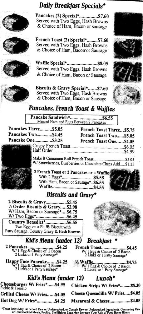 Choice of ham, bacon, sausage, served with hash browns, (two) eggs and toast or pancakes