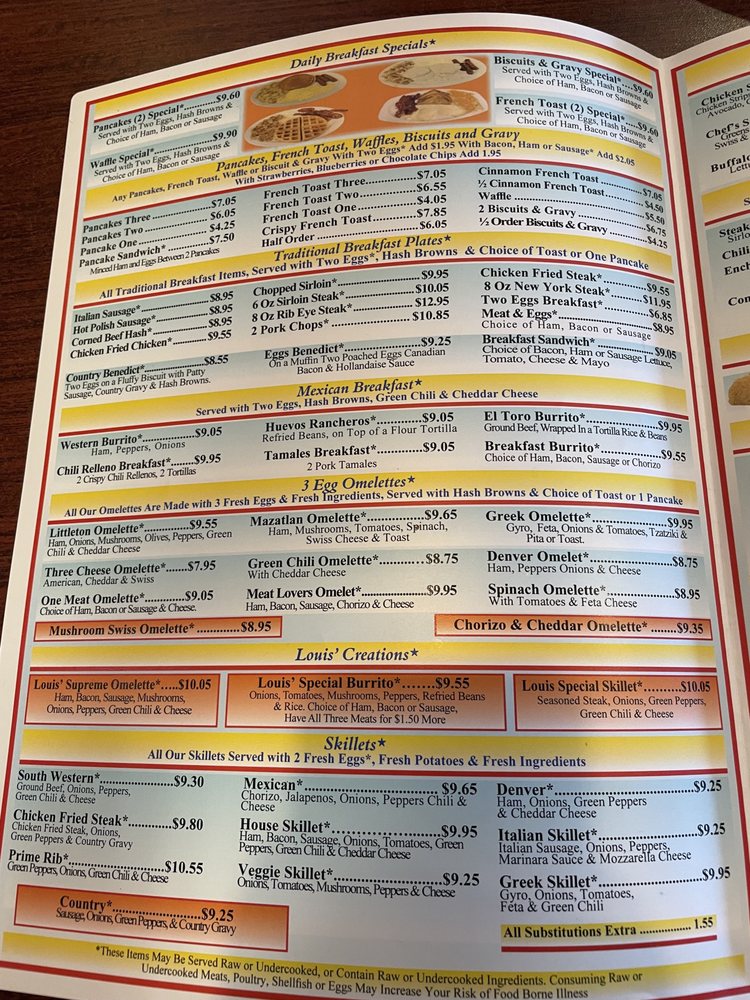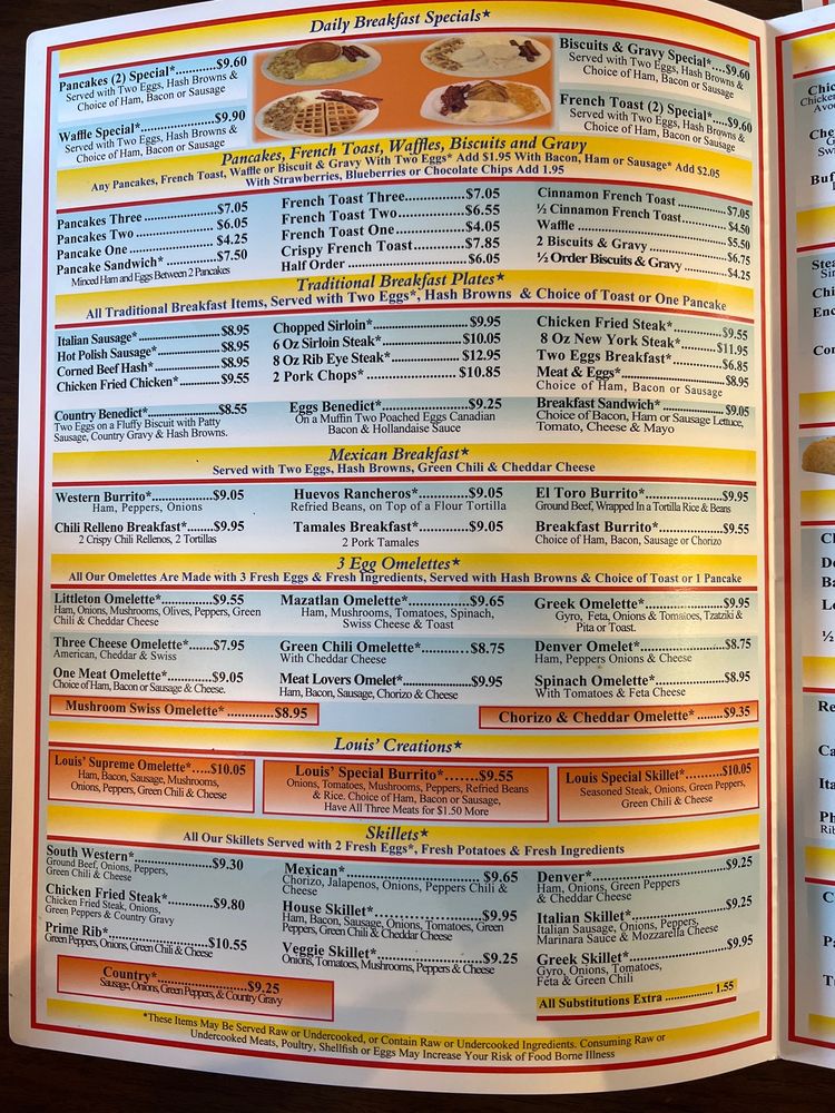 Louis' Diner, located in Littleton, CO, is a quintessential American diner offering a variety of options for breakfast, brunch, and lunch. The cozy and casual atmosphere, along with friendly service, makes it a favorite spot for locals. Customers rave about the delicious and consistent food, with standout dishes like Chicken Fried Chicken and breakfast skillets receiving high praise. The menu caters to a down to earth-real people crowd, providing classic diner breakfast options done right at reasonable prices. With quick and attentive service, Louis' Diner is the perfect place to enjoy a hearty meal without the long wait times often found at upscale brunch spots. From French toast to omelets, each dish is prepared with care, ensuring a satisfying dining experience for all.